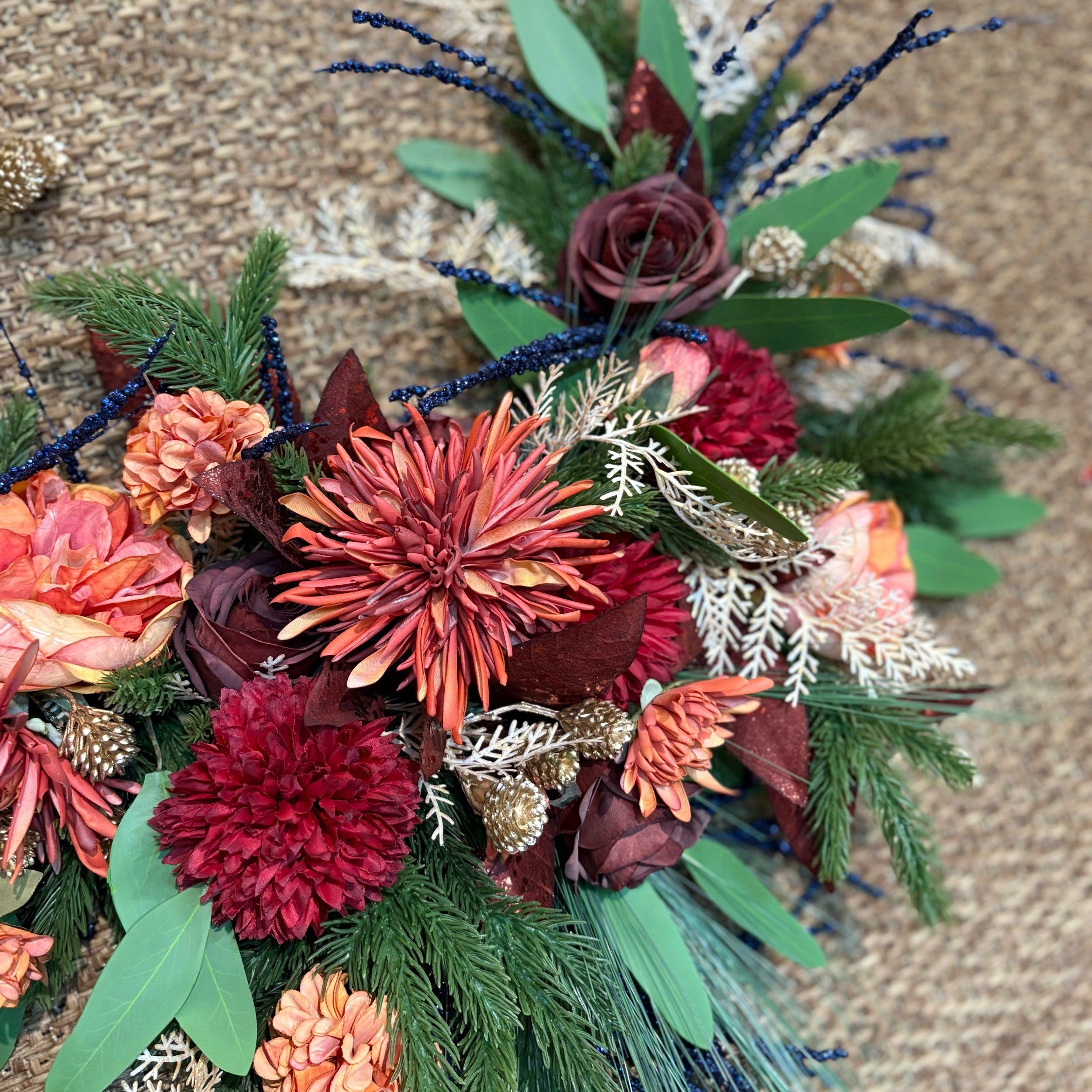 Elements: roses, chrysanthemum, various mums, real-touch eucalyptus, faux berries, glittered foliage